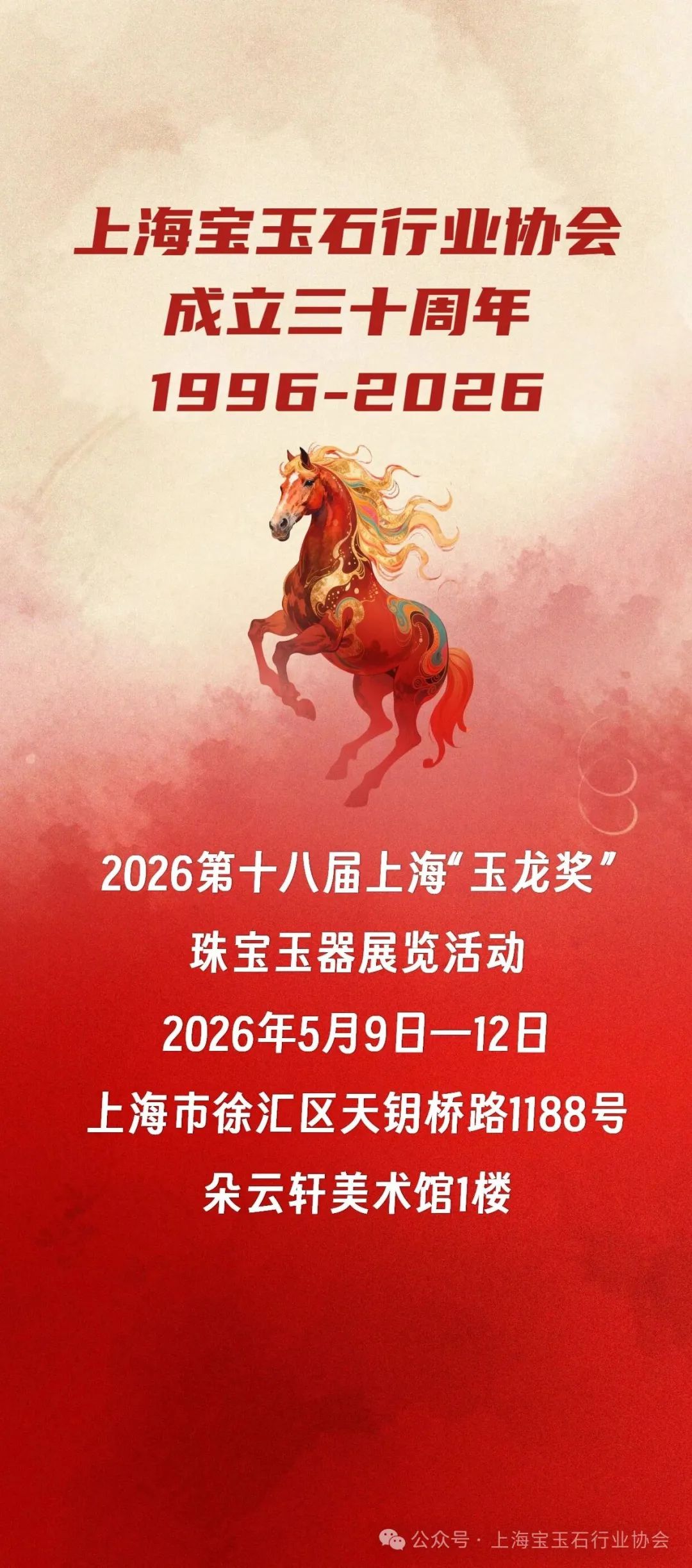 为确保协会三十周年系列活动呈现更高品质、更丰富的内容,经协会研究决定,原定于2026年5月9日—12日举办的第十八届上海玉龙奖珠宝玉器展览将延期举办,具体时间确定后另行通知。